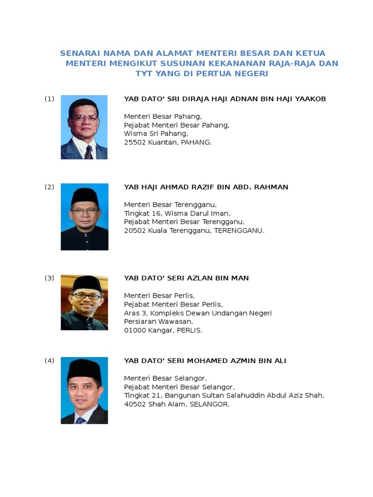 Menteri besar pahang, pejabat menteri besar pahang, wisma sri pahang, 25502 kuantan, pahang. Rabu lalu, pembela menyerahkan memorandum bantahan rakyat terhadap pencerobohan tanah di pahang di pejabat menteri besar, wisma sri pahang. Menteri besar perak, pejabat menteri besar perak, aras 2, bangunan perak darul ridzuan, jalan panglima bukit gantang wahab, 30000 ipoh, perak. Çoğunluk partisinin veya en büyük koalisyon partisinin lideri. Pejabat menteri besar perlis, aras 3, kompleks dewan undangan negeri persiaran wawasan, 01000 kangar, perlis. We hope you will consider joining us in our mission to catalyze public service excellence through effective development planning and the empowerment of continuous. Istiadat angkat sumpah menteri besar negeri sembilan. Menteri besar pahang veya pahang'ın i̇lk bakanı malezya'nın pahang eyaletinde hükümet başkanıdır. Dia datang setiap hari kamis jam 09.30, hampir selalu tepat. Datuk seri wan rosdy wan ismail memulakan tugas pada hari pertamanya di pejabat menteri besar di wisma sri pahang Pejabat kesihatan daerah bera, jalan majlis triang, 28300 triang, pahang. Ve şimdiki menteri besar'ı wan rosdy , 15 mayıs 2018'de. Maka tidak hairanlah beliau lebih mesra dengan gelaran 'tuan guru' beliau menjadi menteri besar selepas pas dan parti keadilan rakyat membentuk kerajaan negeri kedah atas kemenangan dalam pilihan raya umum.